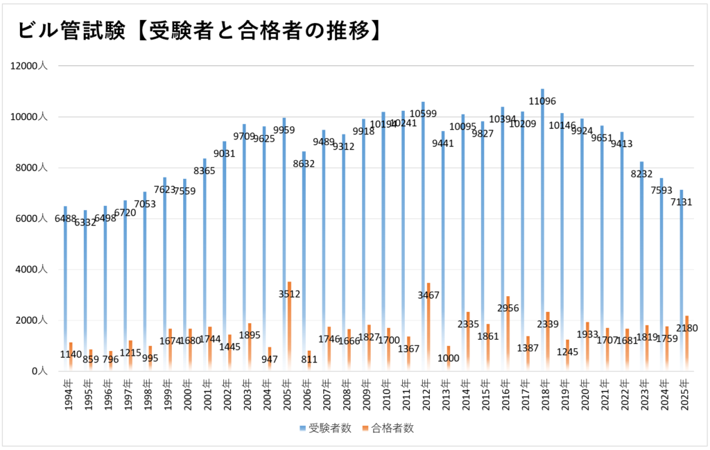 - 近年では約10,000人前後が受験していましたが、2025年度は7,000人近くまで下がっています。兼任要件の緩和が受験者数に影響を与えているといわれておりますが・・・